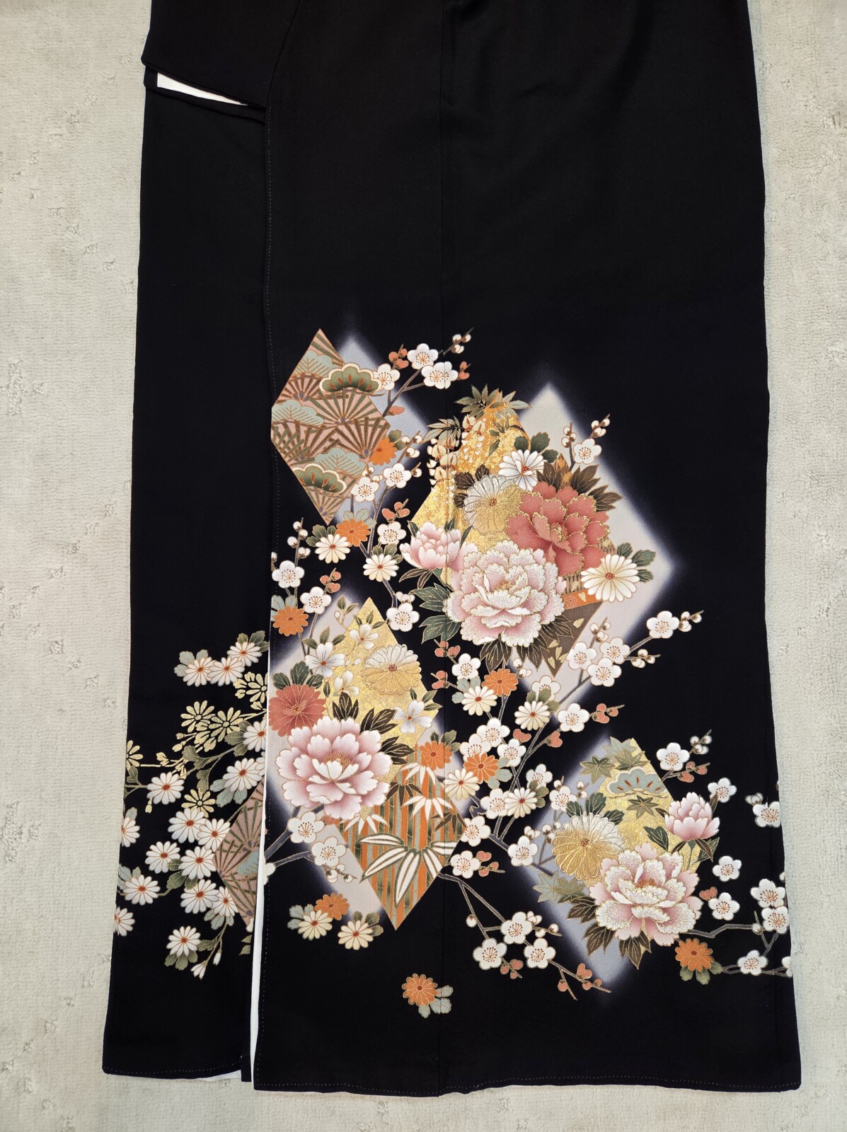 黒地に映えるやわらかな金彩と、可憐な花々が晴れの日にふさわしい格を添えます。