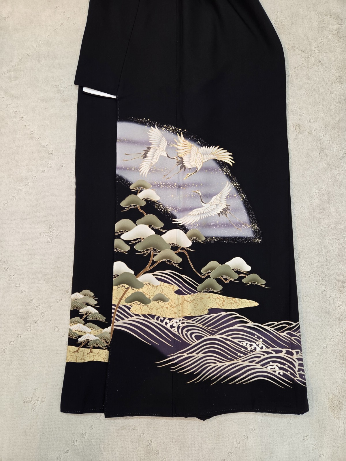 無駄を削ぎ落とした構図の中に、気品と格式を感じさせる一着です。鶴は「長寿」「夫婦円満」の象徴。松は「常緑=永遠」を意味する吉祥文様。